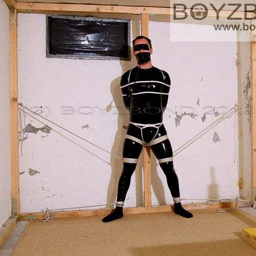 DUDE IN CATSUIT WITH INFLATABLE GAG THEN STRICTLY HOGTIED ON THE TABLE