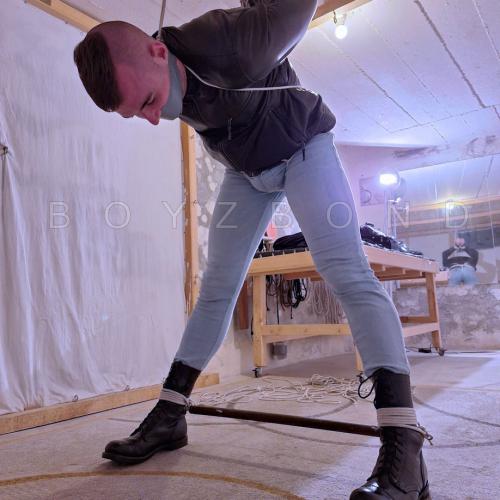 DUDE IN LEATHER JACKET, TIGHT JEANS AND BOOTS IN STRICT ROPE BONDAGE