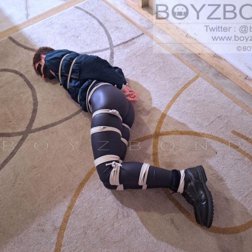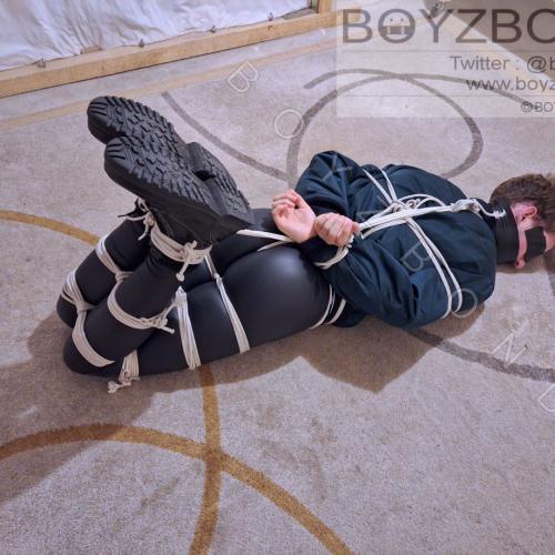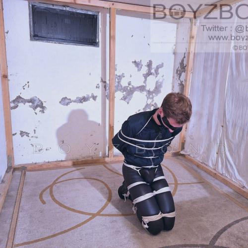 YOUNG DUDE BOUND AND GAGGED IN BOMBER JACKET AND BLACK LEATHERETTE TIGHTS