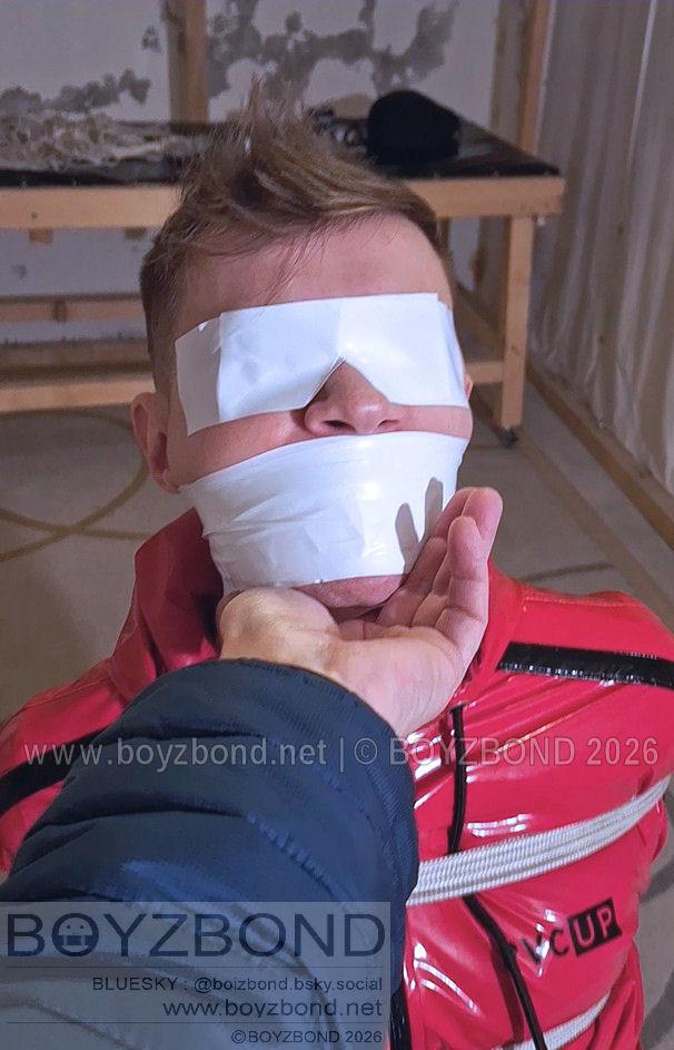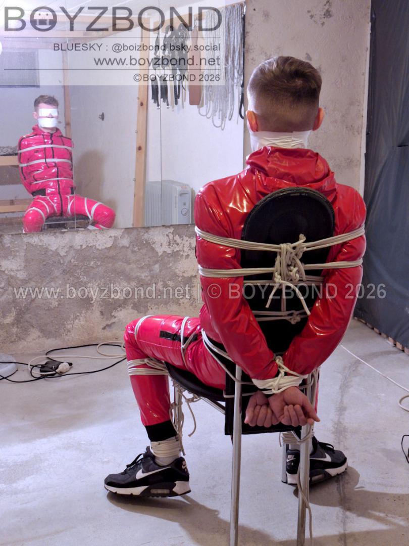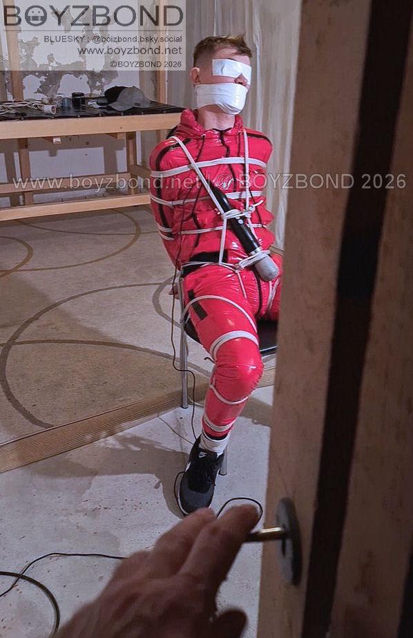 YOUNG LAD BOUND AND GAGGED IN RED PVC TRACKSUIT
