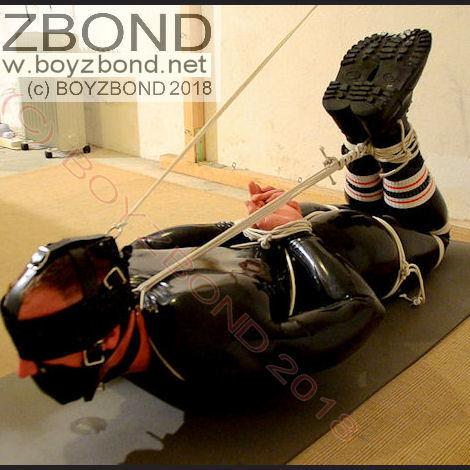 Mec en latex ligoté et bâillonné puis attaché en hogtie sévère