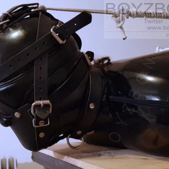 Mec en latex cagoulé, attaché sur la table de hogtie et fessé