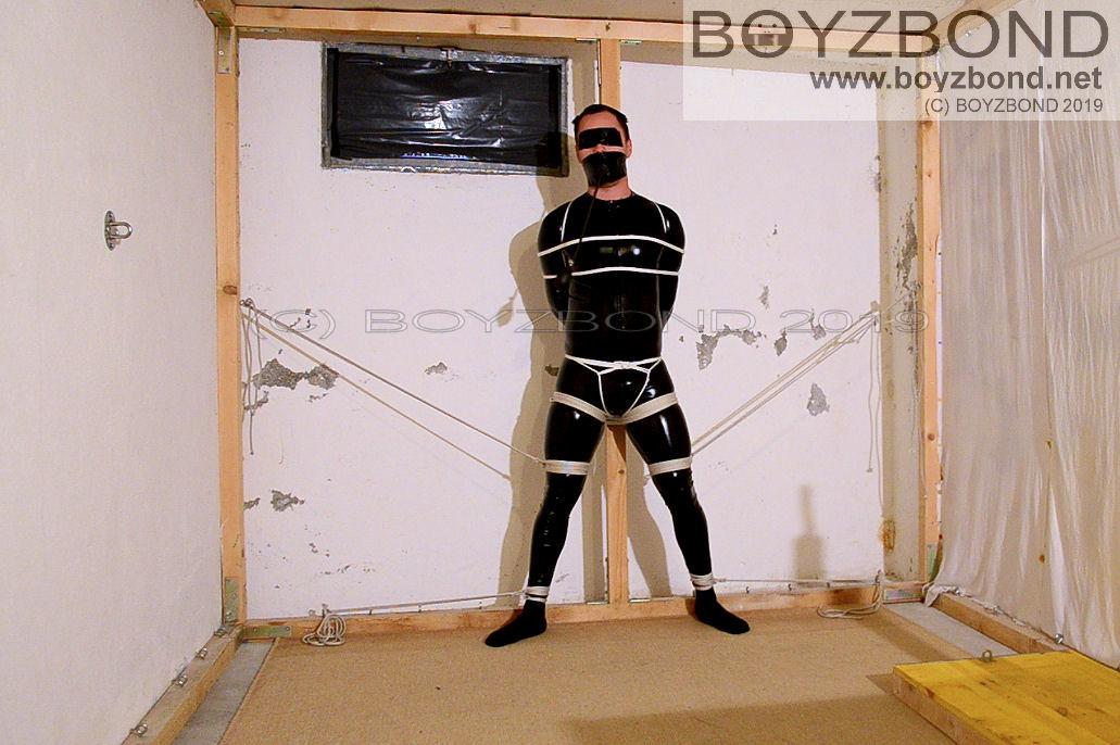 DUDE IN CATSUIT WITH INFLATABLE GAG THEN STRICTLY HOGTIED ON THE TABLE