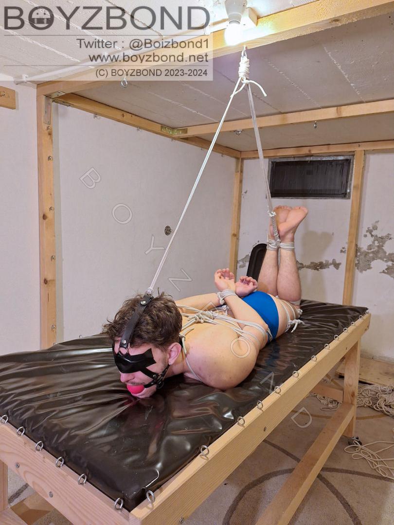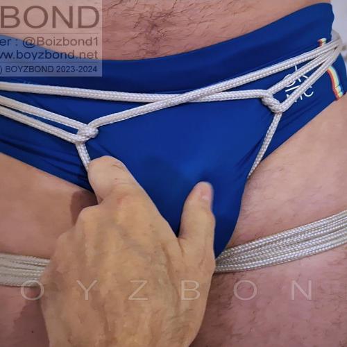 Jeune mec en slip de bain ligoté, bâillonné, en hogtie