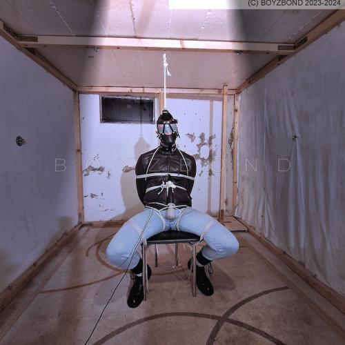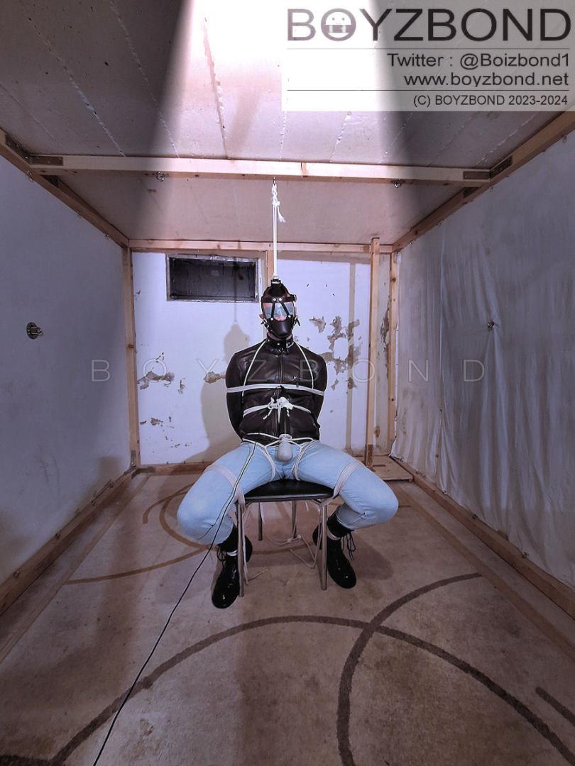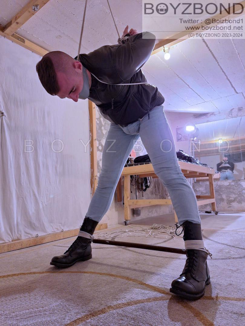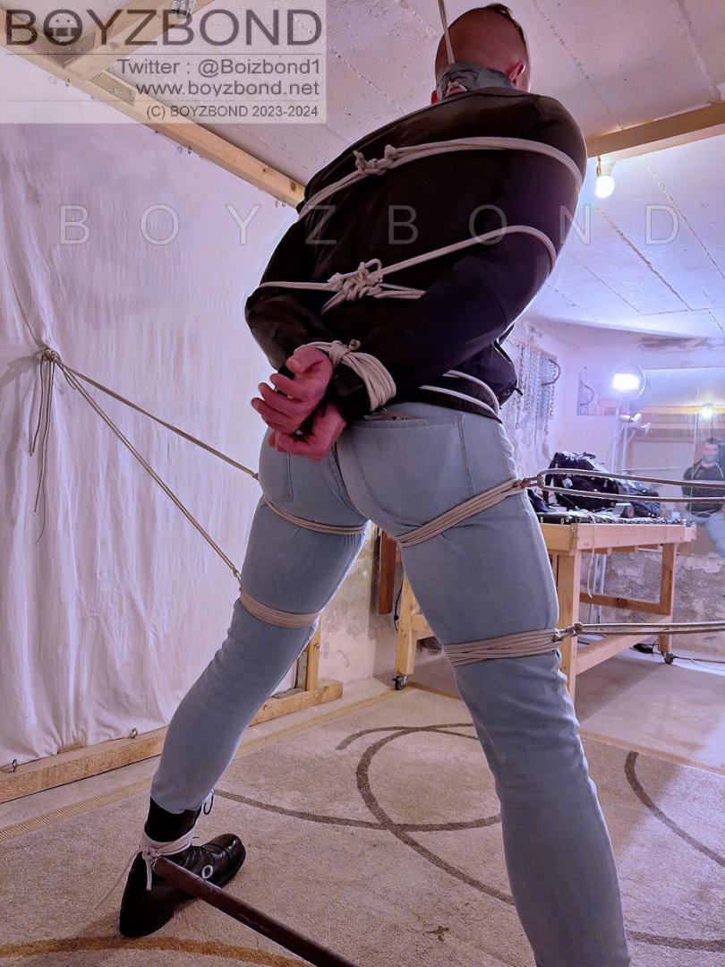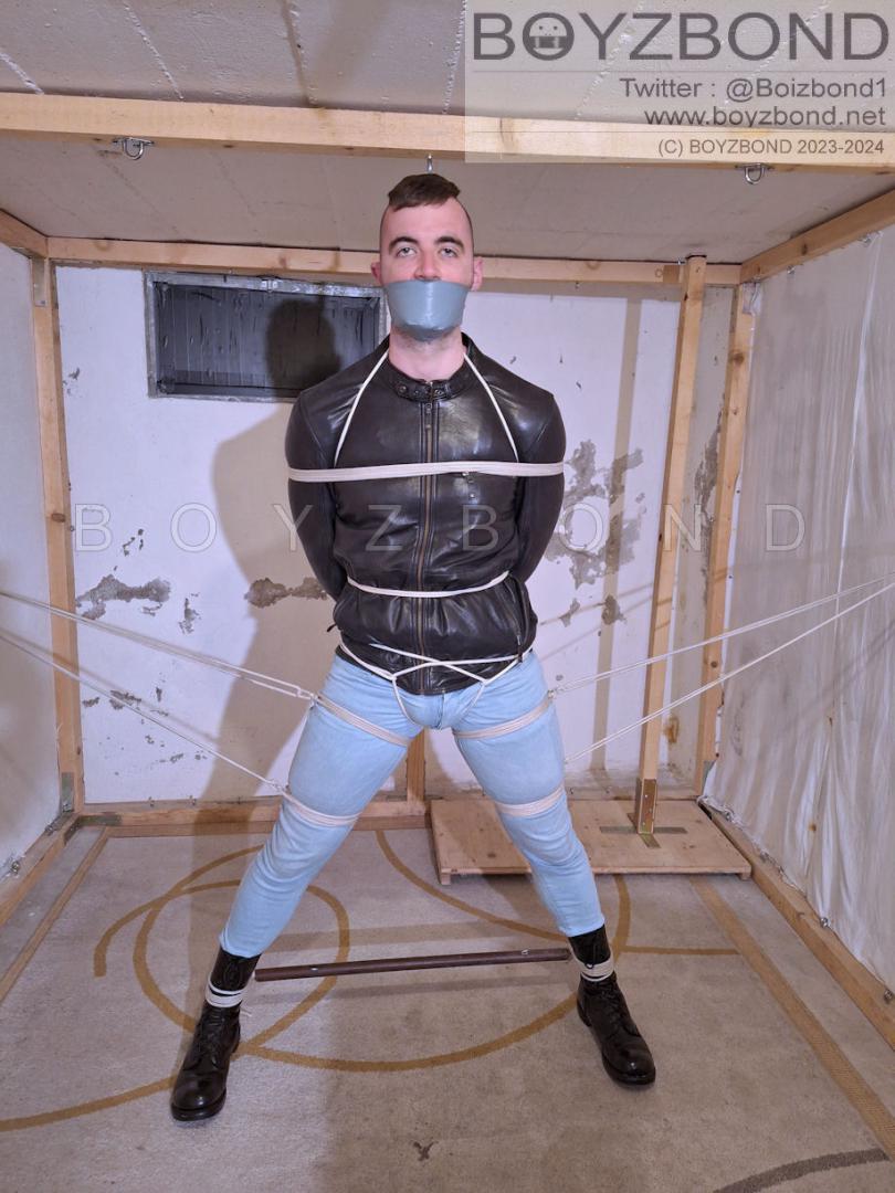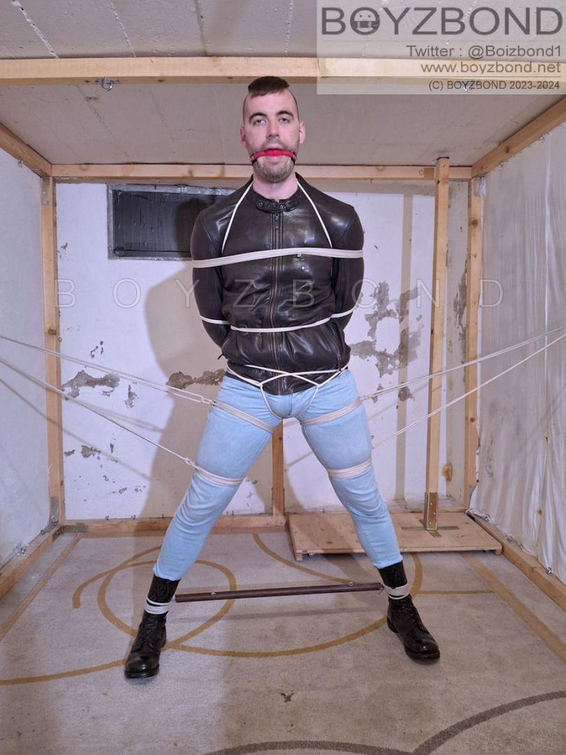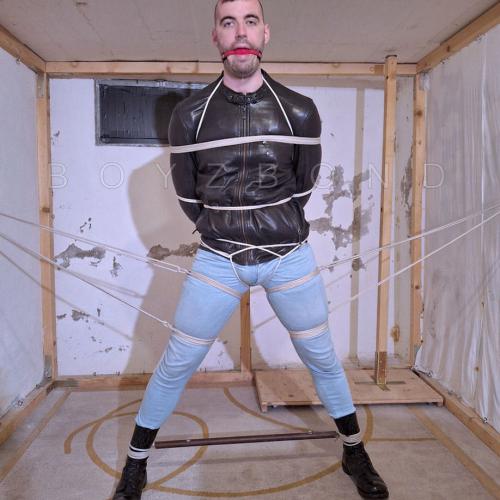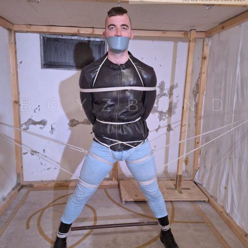 DUDE IN LEATHER JACKET, TIGHT JEANS AND BOOTS IN STRICT ROPE BONDAGE