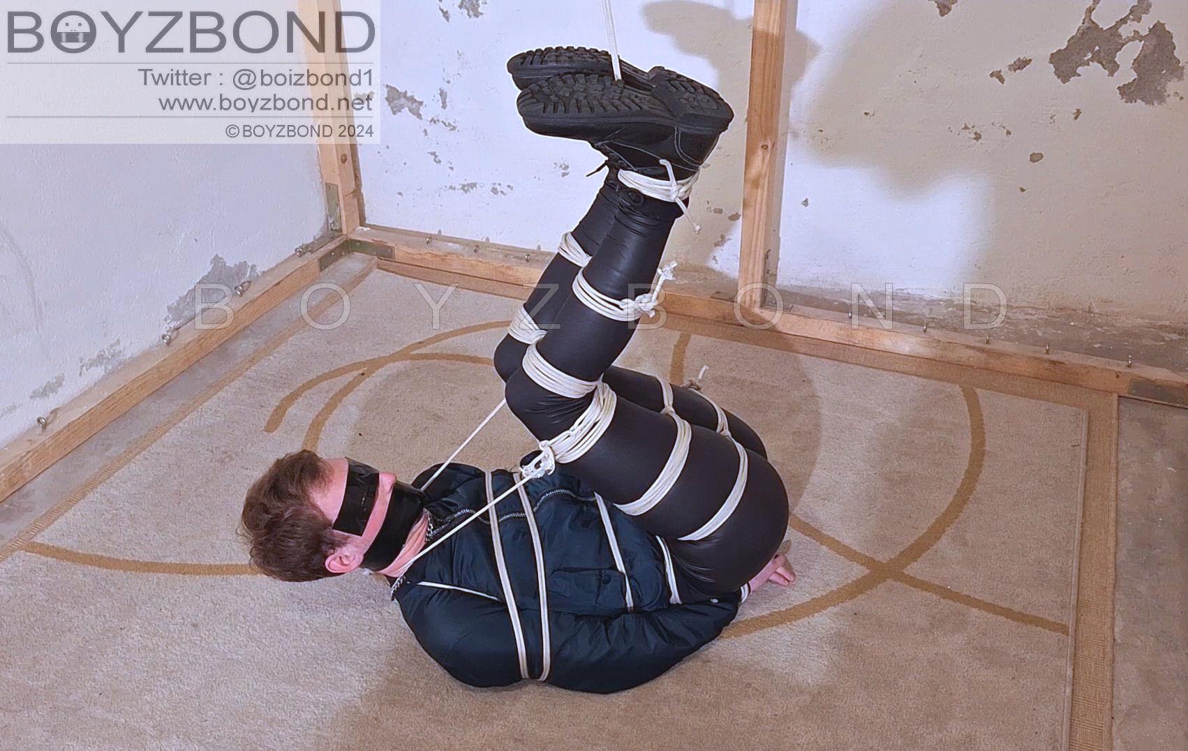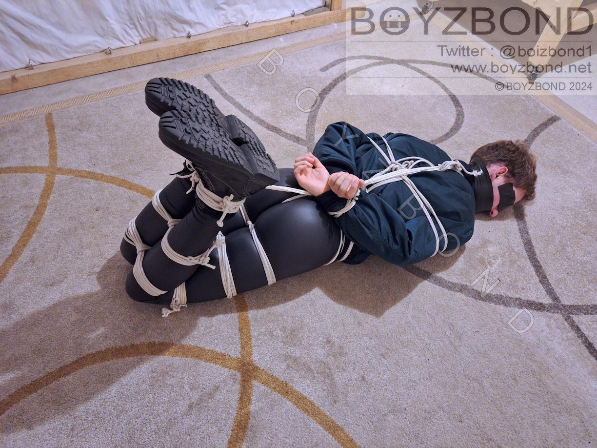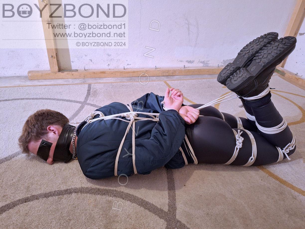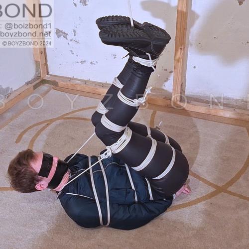YOUNG DUDE BOUND AND GAGGED IN BOMBER JACKET AND BLACK LEATHERETTE TIGHTS