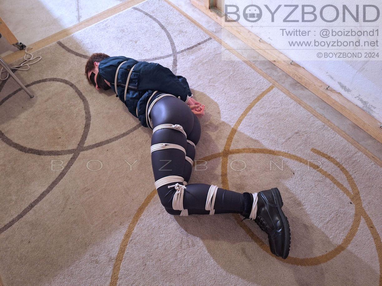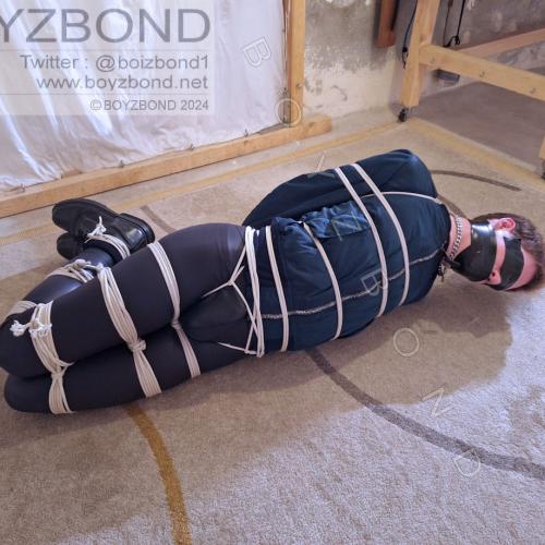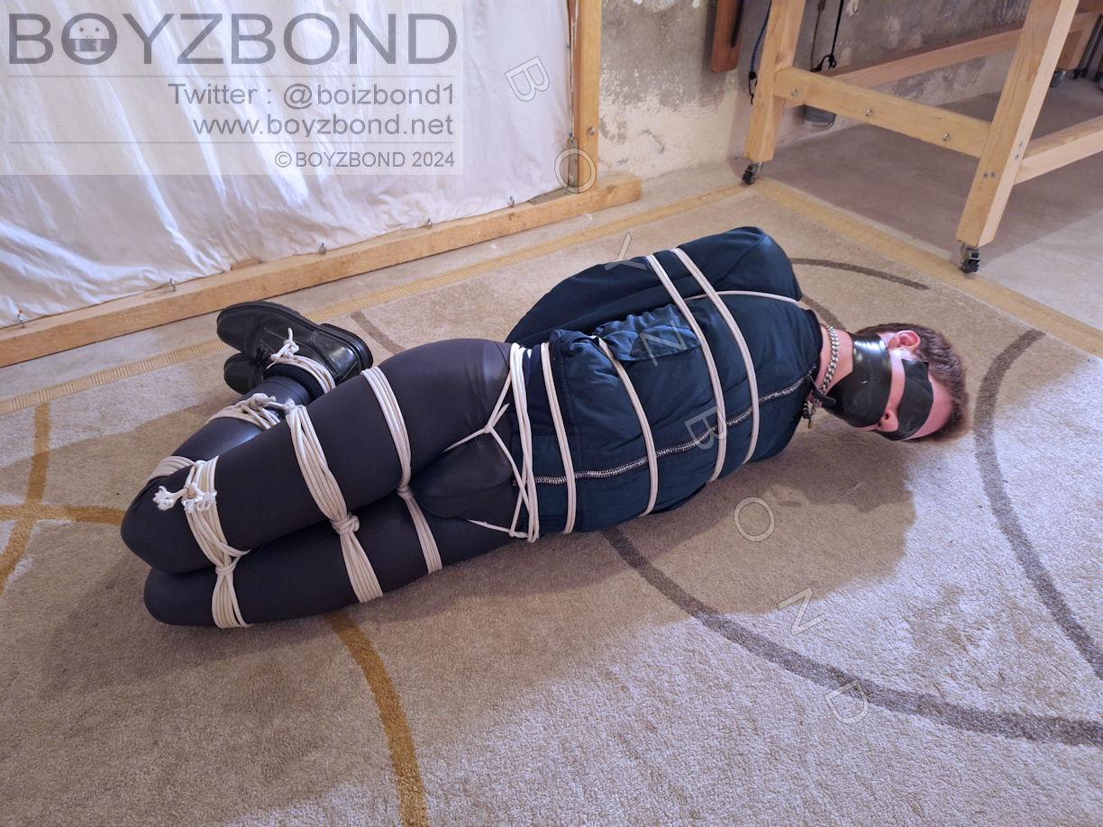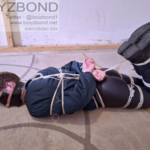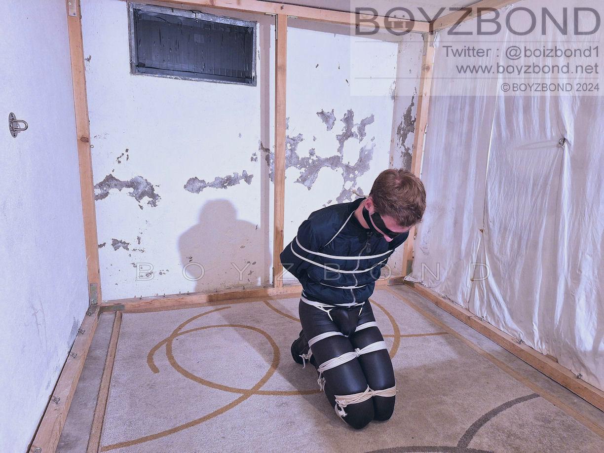 YOUNG DUDE BOUND AND GAGGED IN BOMBER JACKET AND BLACK LEATHERETTE TIGHTS