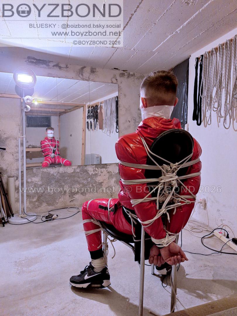 YOUNG LAD BOUND AND GAGGED IN RED PVC TRACKSUIT