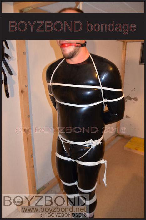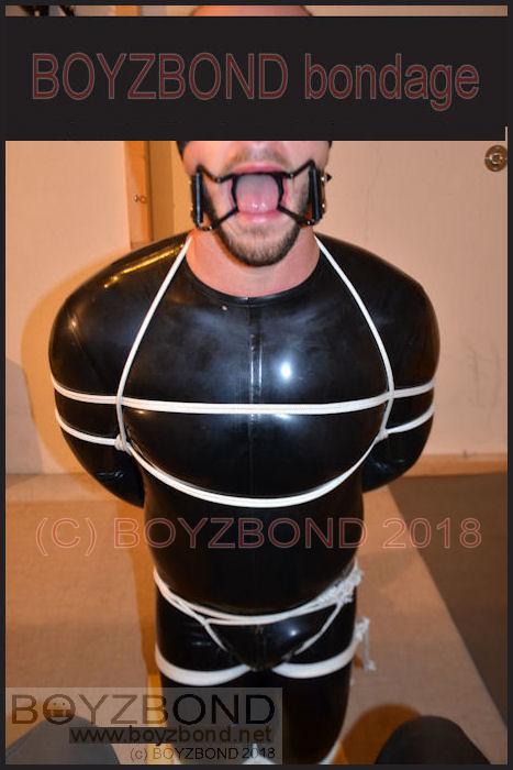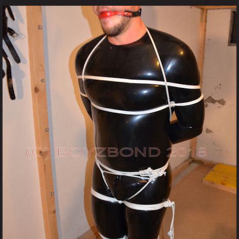Mec en latex ligoté et bâillonné puis attaché en hogtie sévère