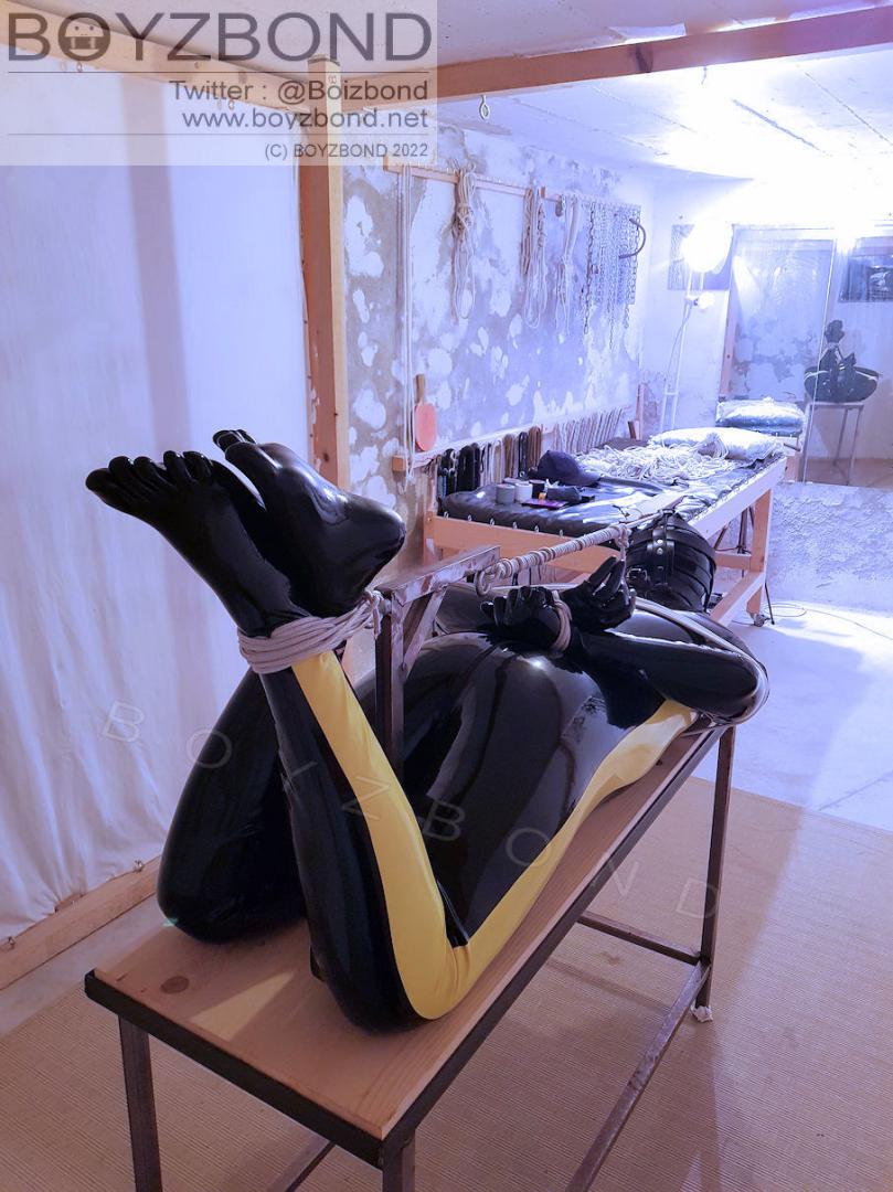 RUBBER GIMP HOODED, HOGTIED ON THE TABLE AND SPANKED