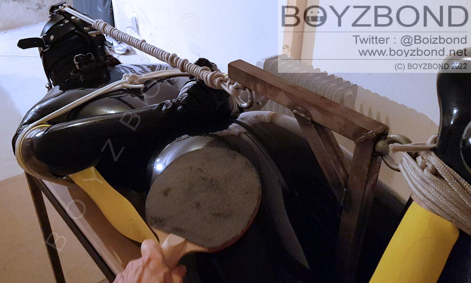 Mec en latex cagoulé, attaché sur la table de hogtie et fessé