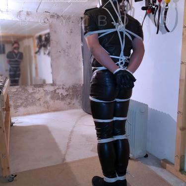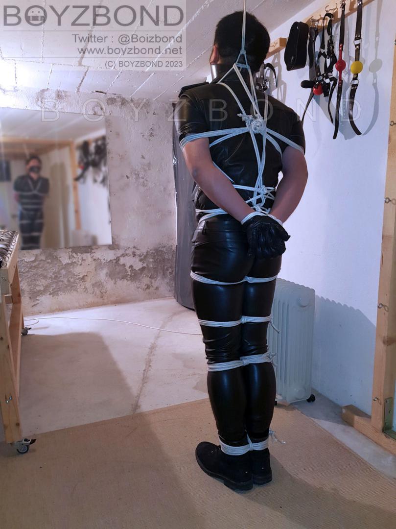 LEATHER BONDAGEBOI IN HOGTIE TRAINING