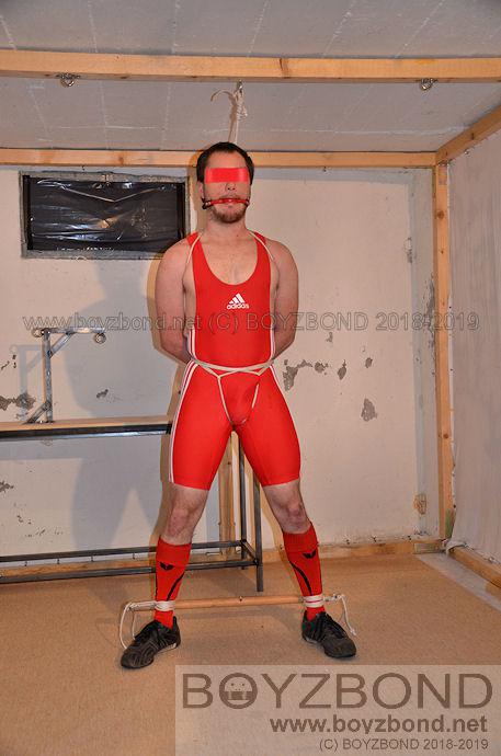 Mec en tenue lycra de lutte ligoté, bâillonné avec un bâillon-boule et scotch