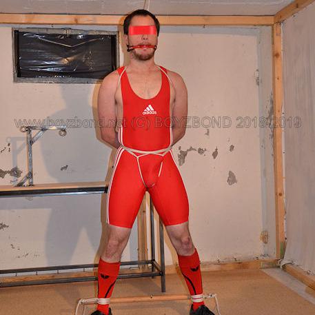 DUDE BOUND, BALLGAGGED, TAPEGAGGED IN RED LYCRA SPORT SINGLET